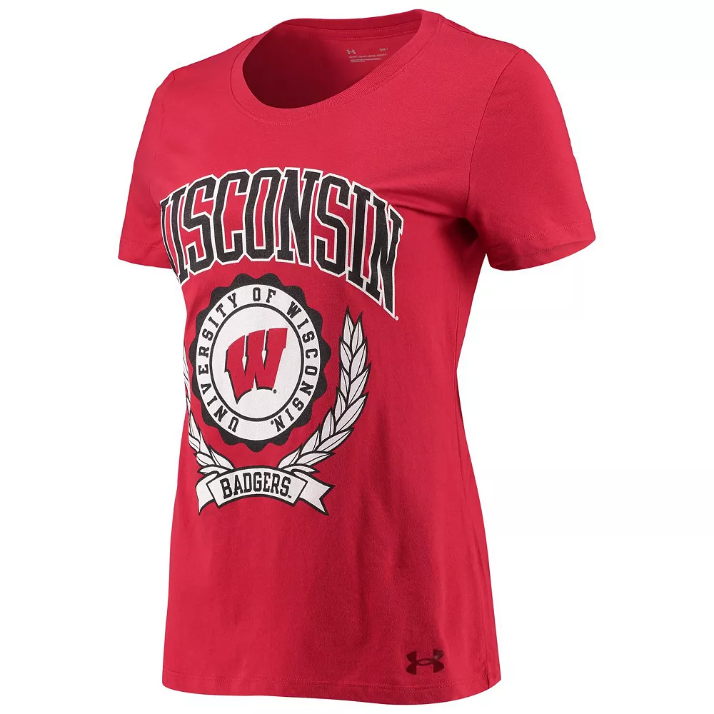 Show your support for your favorites with casual flair by wearing this Wisconsin Badgers T-shirt from Under Armour. It features a bold team wordmark and a distinct graphic that’s sure to make this shirt a new go-to! The crew neck completes this tee with a traditional look.